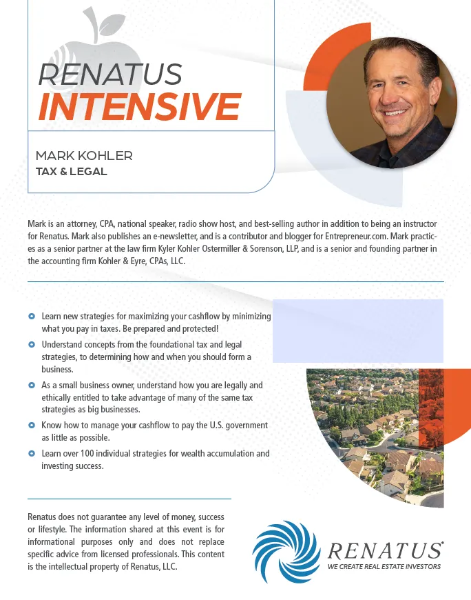 One of our most popular courses by far, CPA/Attorney Mark Kohler will blow your mind with new strategies for maximizing your cash flow by minimizing what you pay in taxes. Be prepared and protected! This intensive will cover planning, protection, deductions, entities and assets. Learn everything from the foundational tax and legal strategies to determining how and when you should form a business, and how to turn that business into a cornerstone of Tax & Legal wealth management program.